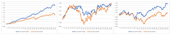 Profit comparison between risk-based weight method and average weight method during pre-crisis, crisis, and post-crisis periods (from left to right).