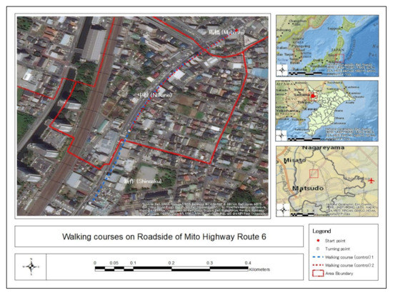 | Route of walking course | Experimental site: Round trip of Village of Green-Gathering Square (walking course 1, 1.2 km) City: Roadside of Mito Highway Route 6 (control walking course 1, 1.2 km) | Experimental site: Round trip of Park center- Nature Observation (walking course 2, 800 m) City: Roadside of Mito Highway Route 6 (control walking course 2, 800 m) | Experimental site: Round trip of Village of Green- Gathering Square (walking course 1, 1.2 km) City: Roadside of Mito Highway Route 6 (control walking course 1, 1.2 km) |