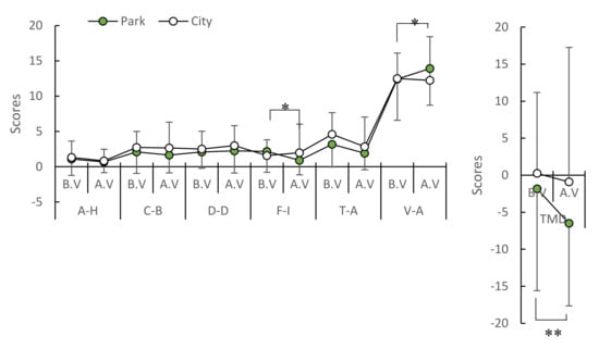 | Total Mood Disturbance (TMD) | −6.5 ± 11.1 | −0.9 ± 18.2 | 0.023 * |