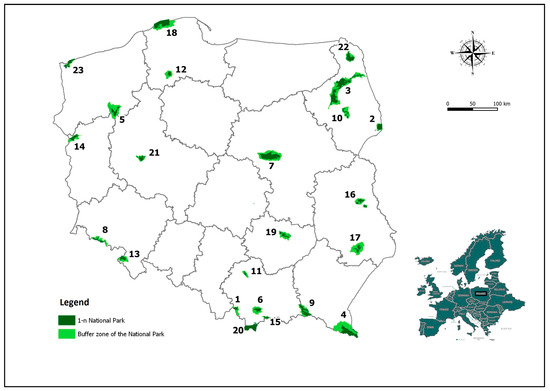 The location of Polish national parks and their buffer zones against the background of the administrative division of the country (voivodship level). Legend: Buffer zone: the area in which protection zones for wild game are created. 1. Babia Góra National Park, 2. Białowieża National Park, 3. Biebrza National Park, 4. Bieszczady National Park, 5. Drawno National Park, 6. Gorce National Park, 7. Kampinos National Park, 8. Karkonosze National Park, 9. Magura National Park, 10. Narew National Park, 11. Ojców National Park, 12. Bory Tucholskie National Park, 13. Stolowe Mountains National Park, 14. Warta Mouth National Park, 15. Pieniny National Park, 16. Polesie National Park, 17. Roztocze National Park, 18. Słowiński National Park, 19. Świętokrzyski National Park, 20. Tatra National Park, 21. Wielkopolska National Park, 22. Wigry National Park, and 23. Wolin National Park.