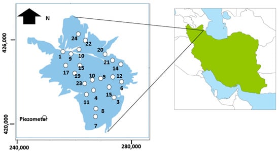 where, is the GWL at month t, is the 1-month lagged H, is the 2-month lagged H, is the 3-month lagged H, and is the 12-month lagged H. The data of 140 months (2000 (January)–2012 (September)) were selected for the current study. A total of 20% of the data set was used for testing, and 80% of the data set was used for the training, that were selected randomly. Nine observed wells (wells 6, 9, 10, 24, 11, 4, 7, 8, and 1) were used to provide the spatiotemporal variation of GWL for different months. Each piezometer had 140 monthly data points. The measurements were made one time during each month.