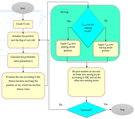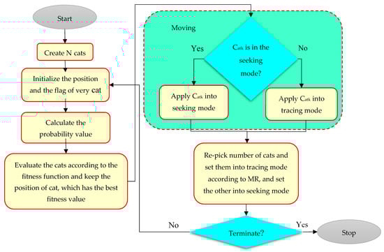 Recently, CSO has gained popularity among other optimization algorithms because of its exploration ability and is widely used in different fields, such as wireless sensor networks [47], robotics [48], data clustering [49], and dynamic multi-objective algorithms [50]. Chu et al. (2006) introduced the cat swarm algorithm [51]. Figure 5 shows the flowchart of CSO. The CSO uses hunting and resting skills for optimization. First, the initial population of cats is initialized randomly. The seeking mode and tracing mode are two important operation modes in the CSO model. The seeking mode demonstrates the resting ability of cats which change their position and remain alert. This mode is regarded as a local search for the solutions. The seeking memory pool (SMP), the seeking range of selected dimension (SRD), and counts of dimension to change (CDS) affect the cat’s behavior. The number of duplicate cats is denoted by SMP. CDC shows that the dimensions are to be mutated and SRD denotes change value of chosen dimensions. In the seeking mode, most of the cat’s time is in the resting time, even though they remain alert [52]. The seeking mode includes the following levels: