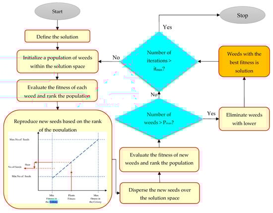 Weeds have a very adaptive nature that converts them to undesirable plants in agriculture. Figure 3 shows the flowchart of the WA algorithm [46]. The WA starts with initializing a random population of weeds in the search space. A predefined number of weeds are randomly distributed over the entire dimensional space, indicated as a solution space. The fitness of weeds is assessed by considering its fitness function to optimize the problem. Each agent of the current population can produce some seeds via a predefined region considering its own location. In this way, the number of produced seeds relies on its fitness function in the population regarding the best and worst solutions, as observed in Figure 3. The number of seeds is computed as follows [46]: