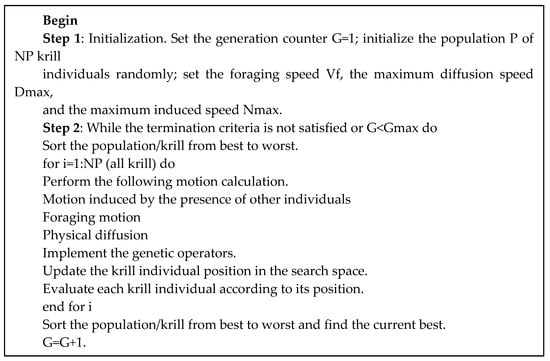 Gandomi and Alavi [54] introduced the KHA using the krill’s behavior in nature [54]. The KHA is widely used in different fields, such as text document clustering analysis [55] and structural seismic reliability [56]. The KHA acts, based on three main concepts: (1) mutation-induced, (2) foraging mutation, and (3) physical diffusion. The following formulation uses the three behaviors mentioned above [54]: