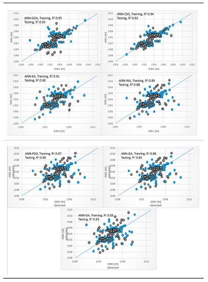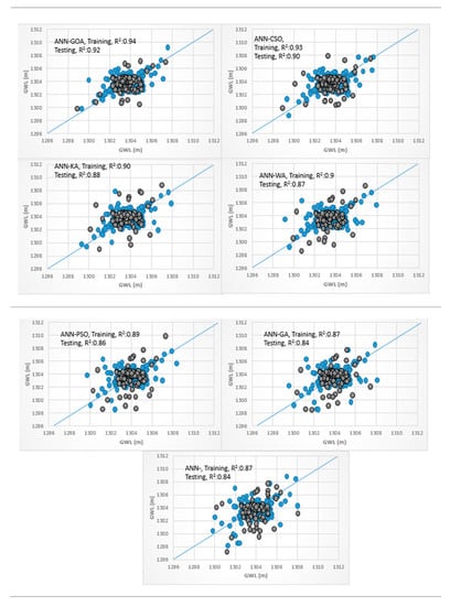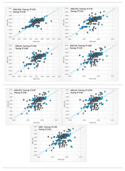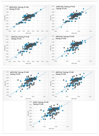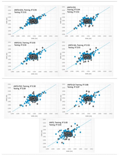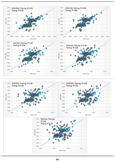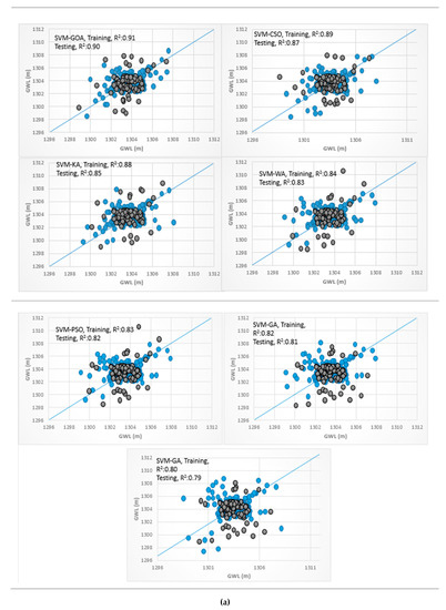 Scatterplots for the soft computing models are provided in Figure 7a for the training and testing phases. It is clear that the hybrid ANFIS-GOA predictions were much closer to the measured data in the testing and training phases with a higher coefficient of determination. This result indicated a better correlation and a larger degree of statistical match between measured and predicted data of ANFIS-GOA relative to the other hybrid ANN and SVM models. The R2 values were found to vary in the range of 0.84–0.94 and 0.79–0.91 for the ANN (hybrid ANN models and based ANN model) and SVM models (hybrid SVM models and based SVM model), respectively. The SVM model had the lowest R2 among other models. Additionally, the ANFIS-GA, ANN-GA, and SVM-GA models had the lowest R2 among other hybrid ANFIS, ANN, and SVM models. There is a weak agreement between the lower and higher values of the actual and estimated GWLs in this scatter plots of piezometer 6, unlike the ANFIS-GOA results.