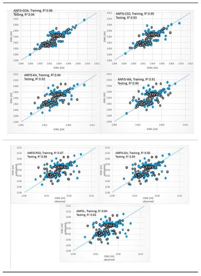 The results of Figure 7c indicated that the ANFIS-GOA and SVM models produced the best and the worst results, respectively. It is clear that developed hybrid ANFIS-GOA model forecasting of GWL was less scattered and closer to the straight line of 1:1 than those the other models and it shows impressive results in regard to the other models. For training and testing phases, GA had a worse performance than CSO, PSO, KA, WA, and GOA because of the lower values of R2. The standalone ANFIS model had the worst performance among the ANFIS-GOA, ANFIS-CSO, ANFIS-WA, ANFIS-PSO, ANFIS-GA, and ANFIS-KA models. The ANFIS-GOA model with R2 = 0.94 as is presented in Table 5, the values of GWL simulated by the ANFIS-GOA are almost equal to the observed values of GWL. The linear fit of the forecasted GWL and measured GWL results have a high correlation coefficient that is very close to 1.00 (R2 =0.97) and a perfect correlation coefficient (R2 value) of 0.94, confirmed that the simulation model has provided a very good prediction of the observed values of GWL. Additionally, 94% of the observed GWL values accurately fit the hybrid ANFIS-GOA model predictions.