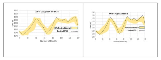 However, general results indicated that the ANFIS-GOA has the best performance among other models. Figure 9 shows the coefficient of variation for different optimization algorithms. ANFIS-GOA had a lower coefficient of variation than other models and optimization algorithms. The worst results were for GA. In general, there are three main sources that generate the uncertainty of model outputs: the first one is the data and knowledge uncertainty, the second one is the parametric uncertainty due to unknown model parameters, and the third one is the structural uncertainty due to physical complexity of phenomena. The main contribution of the current paper is the uncertainty analysis of hybrid models prediction of GWL in the form of parametric uncertainty due to regulatory parameters and weights produced in the training stage of models.