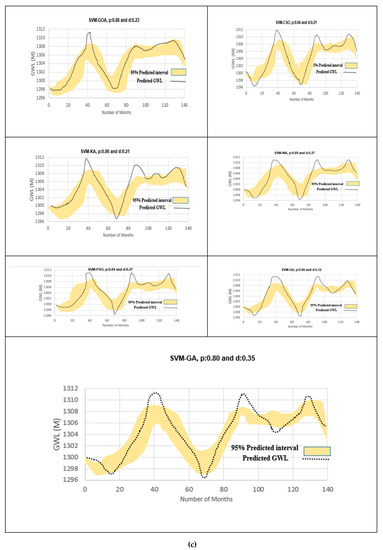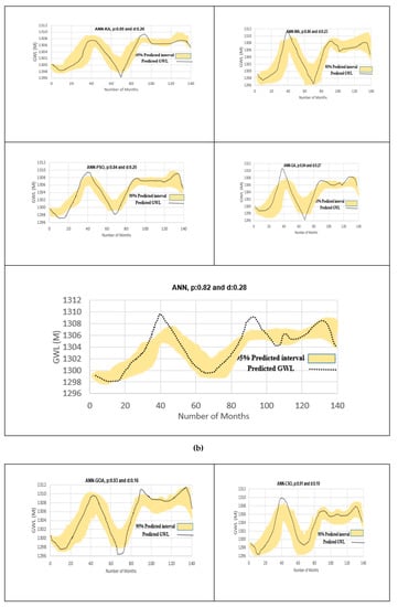In the trained hybrid models, the uncertainty in the model trained parameters and weights is the major source of uncertainty in model results. Here the effects of uncertainty in trained, optimization, and determination of parameters, and weights of intelligence developed hybrid models for piezometer 6 are presented. For training and testing stage, the uncertainty of the models results in piezometer 6 are provided in Figure 8a and in Table 6. The uncertainty results are quantified by the two indices of p and d and visualized by the uncertainty bounds of 95%. At first, the values of p show how many of the observed GWL values in the training and testing stages are positioned inside the 95% confidence bounds. Secondly, the d-factor as the measure of deviations should be small also. Figure 8 indicated that the highest and lowest d was obtained for SVM and ANFIS-GOA, respectively. Based on p and d indices, CSO had better performance than PSO, GA, KA, and WA. Results indicated that the standalone ANN, ANFIS, and SVM models had higher d and lower p than hybrid ANFIS, ANN, and SVM models that indicate higher uncertainty in the standalone model results. The overall comparison of the results indicated that the ANN model outperformed the SVM model. The d values of uncertainties of models in Table 6 show that in all of developed models for GWL the d value is lower than 1, that proves the superior tight bounds of developed models. The best results are derived by the ANFIS-GOA with d = 012 and p = 0.94 indicates that developed model 95% of observations are covered by the uncertainty bounds. The desired values for p in model uncertainty analysis have values greater than 80% [49].
