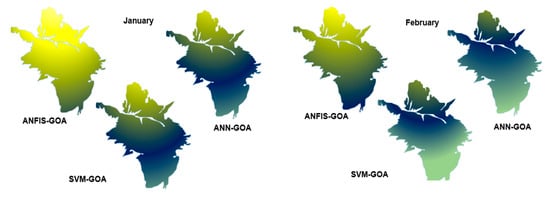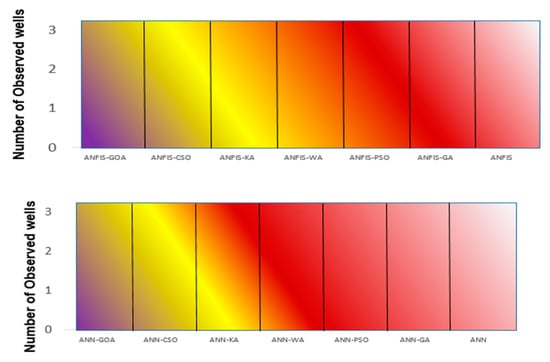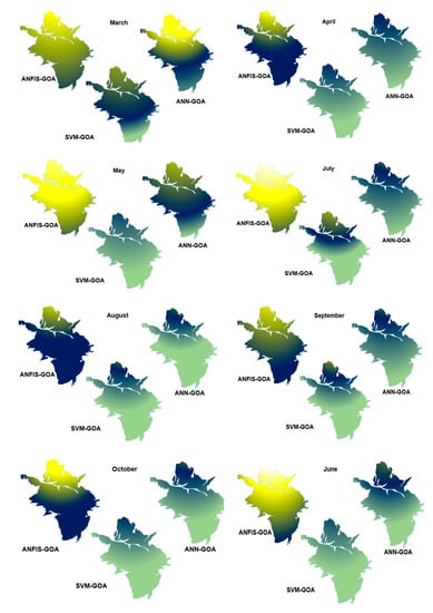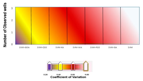 The previous section indicated that the GOA improved the performance of ANN, ANFIS, and SVM models. The results indicated that the GOA had better performance than other optimization algorithms. As shown in Figure 9, the hybrid GOA models (ANFIS-GOA, ANN-GOA, and SVM-GOA) have low variation coefficients in modeling.