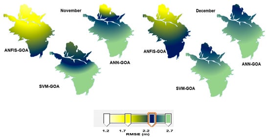Most literature reviews revealed only a few quantity comparisons. Furthermore, they did not include the spatiotemporal variation of GWL. In this section, the latitude, longitude, H(t-1), H (t-2), H (t-3), H (t-4), and H (t-5), hydraulic conductivity (HC), and specific yield of nine observed wells (well 6, 9, 10, 24, 11, 4, 7, 8, and 1) were used to provide the spatiotemporal variation of GWL for different months. The Ardebil plain is a heterogeneous aquifer. Thus, the hydraulic conductivity and specific yield spatially vary in the Ardebil plain. HC is a measure of a material’s capacity to transmit water. The specific yield is defined as the ratio of the volume of water that an aquifer will yield by gravity to the total volume of the aquifer. A pumping test method was used to obtain the value of the hydraulic conductivity and specific yield. Figure 10 shows the measured hydraulic conductivity and specific yield for the Ardebil plain. In this section, the ANFIS, ANN, and SVM models with the best algorithm (GOA) were used to provide the spatiotemporal variation of GWL. The difference between estimated GWL models and observed GWL was computed for all months of years. The RMSE was used as an error function to compare the estimated data with the observed data. From Figure 11, it was clear that the ANFIS-GOA provided more accurate estimation than ANN-GOA and SVM-GOA. It was clear that the RMSE of ANFIS-GOA varied from white (1.2 m) to dark blue (2.2), while the RMSE of ANN-GOA and SVM-GOA varied from 1.7 (yellow) to 2.7 m (light green). Thus, results indicated that ANFIS-GOA has higher accuracy for the heterogeneous aquifers. The heterogeneous aquifers are considered as complex hydraulic systems because their hydraulic parameters vary spatially and temporally. Additionally, the climate parameters, such as temperature and rainfall, can increase the complexity of prediction of GWL for heterogeneous aquifers.