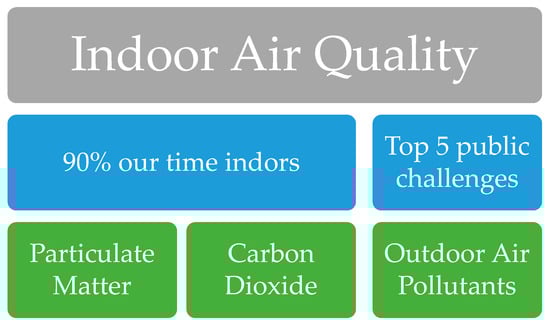 In sum, IAQ is a critical matter ranked in the top five public challenges worldwide (Figure 1). People typically spend 90% of their time inside buildings. On the one hand, PM is a critical air pollutant of indoor environments and must be monitored in real-time for Enhanced Living Environments. On the other hand, CO2 is a relevant parameter to be controlled [,]. CO2 results from human metabolism and the indoor concentrations indicate the overall degradation of the air quality as a whole [,,].