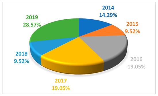 Figure 3 shows the distribution of the percentage of the analyzed studies according to the publication year. Most of the papers considered in this work were conducted in 2019, representing 28.57%. In total, three studies were conducted in 2014, two studies correspond to the year of 2015 and 2018, four papers were published in 2016 and 2017, and six research papers were published in 2019.