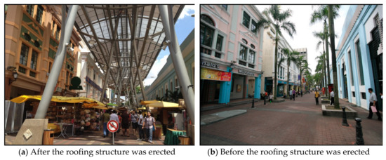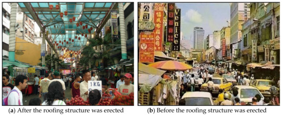 Jalan Hang Kasturi, after and before the covered pedestrian street project. (a) After the erection of the covered pedestrian walkway, the once empty street of Jalan Hang Kasturi. (b) Turned into a street market and renamed as “Kasturi Walk’.