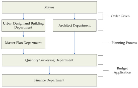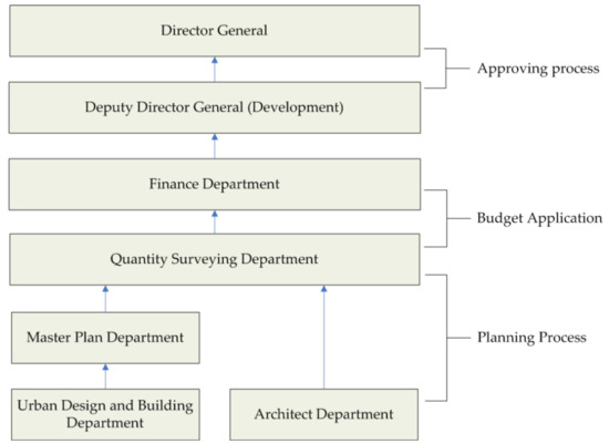 On the other hand, bottom-up is the normal procedure for any well-managed organization. It works on specific departmental plans and implements its program. Usually, this approach is used for minor and routine programs. The Kuala Lumpur City Hall starts with either the Urban Design and Building Department or the Architects Department proposing its program (Figure 4). Its estimated costs will be assessed by the Department of Quantity Survey. For the Department of Urban Design and Building, it has to go through the Department of Master Plan for confirmation, as it involves the city’s structural plan. The Department of Finance will then approve the request for allocation in accordance with the budget allocated to that department. Finally, the Deputy Director-General or the Director-General shall authorize the execution of the project at the agreed cost. This approach, similar to the top-down approach, requires an inter-departmental discussion in order to obtain a standard view and input from all departments directly or indirectly involved in the project area.
