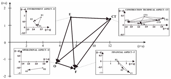 In order to show the interdependencies of aspects, the total impact matrix of aspects − was calculated (Table 4). As can be seen in Table 4, the Construction-technical aspect (CT) is very important. The aspect of the environment (E) has the most influence on other aspects, while the Financial aspect (F) is influenced the most by the other aspects.