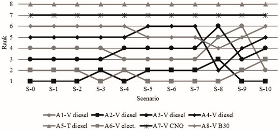 Scenario S-0 represents the existing scenario, while the S-1 represents the ranking of observed alternatives if the electric power is produced from renewable sources (zero emission of CO2 from well to wheel). S-2 and S-3 represent scenarios where there are subsidies of £15,000 and £20,000, whereby the use of renewable sources is significantly increased, respectively. Additionally, we have observed scenarios where the relative weights of criteria vehicle price (F1) and CO2 emission (E1) are the same (S-4), they have the same weights but the electric van emission is zero (S-5), where the importance of E1 criterion is twice as high as the importance of F1 (S-6), and where the relative weights of criteria F1 and E1 switch places (S-7). We have researched the rank of alternatives when the compatibility with the existing vehicle fleet of all alternatives is the same (S-8). Scenario S-9 represents the case where the number of safety technical systems is the same for all vehicles. Since the maintenance costs for alternative A1 are very high, in scenario S-10 we examined what would happen if these costs were the same as for the alternative A2. The ranks of alternatives for all of these scenarios are shown in Figure 3.