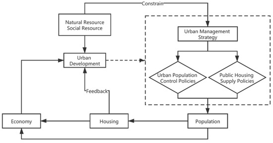 Municipal governments are the main body of housing construction, and have full initiative in the implementation. Therefore, the formulation of public housing supply policies is supposed to be coherent to the framework of the urban management strategy. In other words, the policy content mirrors the orientation of the city, which is the reason to introduce the urban management strategy into this model. In the model, the urban management strategy consists, briefly, of urban population control policies and public housing supply policies. The former aims to limit the growth of urban population, while the latter is to guide the change of urban housing structure. The model will be used to simulate the impact of public housing supply on urban growth, and the urban population control policies and public housing supply policies will be used as the devices for regulation to simulate the dynamics of urban system under the combination of different policies.