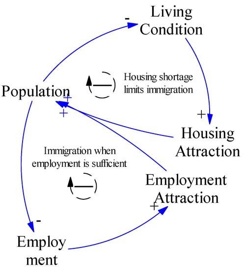 In the case of urban growth caused by supply, when the price of goods and services reduces, the quantity increases, followed by the reduction of wage of labor force and the increase of employment. Furthermore, the demand of real estate increases, resulting in the increase of rent [48]. The interaction among the key elements in the system forms multiple feedbacks that affect urban development. Next, it will be decomposed into three subsystems for further analysis.