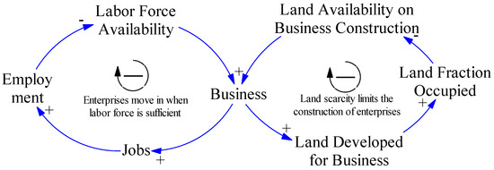 Similarly, there are two major feedback loops in the economy subsystem (Figure 3). One of them depicts the relationship between business and labor force. The increase of business provides more jobs, which also means more demand for labor. If there is no increase in the number of labor, the demand for labor will not be met, which in turn will inhibit the growth of business. The other depicts the relationship between business and land. With the increase of business, the construction land needed will also increase. The difficulty of acquiring land for construction will gradually increase, thus limiting the increase of business.