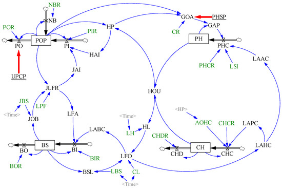 The flow diagram of the simplified urban development system is exhibited in Figure 5. The variables in the flow diagram are listed in the Appendix A.