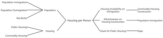One of the critical variables in this model is House per Person, which is the auxiliary variable as a linkage between the population subsystem and the housing system. It represents the living condition and is the key index to simulate the policy effect in the system. It is not only related to the number of commodity housing and public housing, but also affects the migration of population. Figure 6 provides the variables and their causal links related to this core variable in the system.