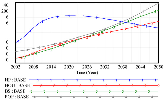 Taking Chongqing as the research area, data from 2002 to 2017 are used for parameter design and model testing, and then the system dynamics from 2018 to 2050 are simulated. Figure 8 displays the basic simulation results of the overall trend of housing, population and economy from 2002 to 2050. During the simulation period, the number of housing, population and enterprises are growing continuously, among which the growth rate of enterprises and population is basically stable, while the growth rate of housing has obvious changes. The growth rate of housing in the early stage is quite fast, while slows down significantly in the later stage.