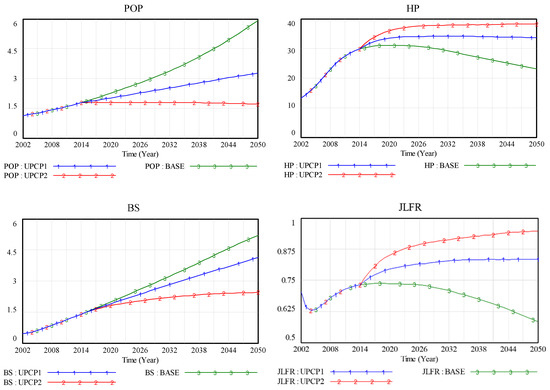 The meaning of urban population control policy in the system is to increase population outflow. Whether the population is forced to move out by means of control or guided by means of incentive, its policy purpose is to reduce the total population in the city. The population control policy variables were set as 1.5 (UPCP1) and 2 (UPCP2) since the Housing per Person entered the stable period in 2014. BASE was the control group with the policy value as 1. Following test results were obtained (Figure 9).