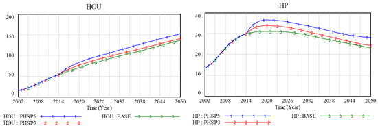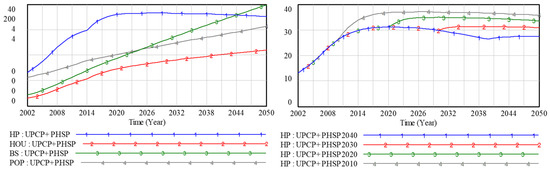 The meaning of public housing supply policy is to raise the goal of public housing construction. The difference of policy intense affects the housing construction speed towards differentiated goals. The public housing supply policy variables were set as 3 (PHSP3) and 5 (PHSP5) since the Housing per Person entered the stable period in 2014. BASE was the control group with the policy value as 1. The following test results were obtained (Figure 10).