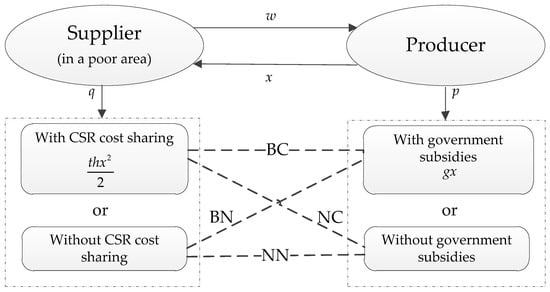 Our work is motivated by Sodhi and Tang [29] and poverty problems in practice. We consider a poverty-alleviation supply chain composed of one supplier and one producer. The supplier is in a poor area, accepts the producer’s investment to develop local products and then sells them to the producer at unit wholesale price . The supplier is the price-taker because of their weaker market power. The supplier’s cost is , similar to that in Niu et al. [49]. The first part denotes the planting cost of the unit product input by the supplier, such as the costs of seeds, chemical fertilizer and pesticides. is the cost coefficient of the planting cost of the unit product, and . The second part denotes the effort cost of the unit product, such as the time and effort spent by the supplier. is the cost coefficient of the effort cost of the unit product; is large due to the lack of advanced production technology, and ; is the output of the supplier, all of which will be supplied to the producer. The producer takes the initiative to fulfill CSR to alleviate poverty, investing in the supplier and providing training to cut the supplier’s cost. is the CSR level of the producer. The higher the CSR level is, the larger the investment needed for poverty alleviation. We assume that the CSR cost for poverty alleviation is , where is the CSR cost coefficient and captures the decreasing marginal effect of CSR, , similar to Ni et al. [51]. CSR also affects the supplier’s cost , similar to Tang et al. [52]. For instance, the producer provides ‘raw material’ to the supplier, such as seeds, seedlings and pesticides, to cut the supplier’s cost. Without loss of generality, our work presupposes . The producer sells the product to the consumer at retail price set by the producer. Similar to Li et al. [53] and Raj et al. [45], our work considers a linear market demand function as follows: , where is the initial market share, is the coefficient of price sensitivity and is the coefficient of consumer social responsibility sensitivity, . According to the market demand function, we obtain . To encourage the producer to take initiative to engage in poverty alleviation by fulfilling CSR, the government subsidizes the producer according to the CSR level , where is the total government subsidies and is the coefficient of government subsidies, . The higher the CSR level is, the more government subsidies have been made. To make the supplier’s profit be positive and negative definite of a Hessian matrix under which the decision problem in each model has the maximum value, our work assumes , and . Then . Consumers are willing to pay more for CSR products [54], , similar to Liu et al. [44]. Then for the feasibility and convenience of calculation, our work assumes , and .