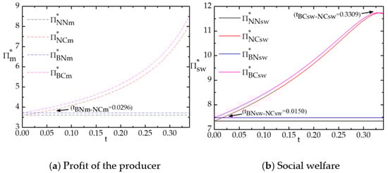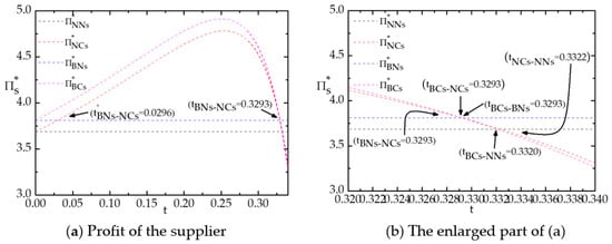 In this section, we mainly discuss the impact of on the supplier’s profit, the producer’s profit and social welfare by comparing BN and NN models. We claim that government subsidies are effective when the total subsidy amount is smaller than the supplier’s profit growth or social welfare growth.