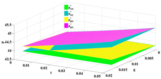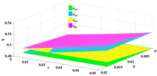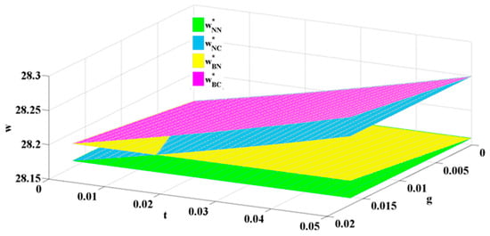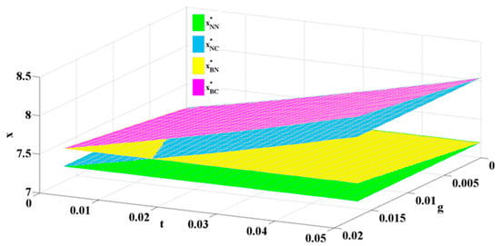 (3) The CSR level, wholesale price, output of the supplier and retail price are the highest in the BC model and the lowest in the NN model which is independent of CSR cost sharing and government subsidies. However, the comparison of the CSR level, wholesale price, output of the supplier and retail price in the NC and BN models are closely related to government subsidies and CSR cost sharing (Figure 6, Figure 7, Figure 8 and Figure 9).