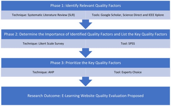 The methodology used in this research consists of three phases: in the first phase, a literature review was conducted to explore and identify the relevant factors that impact the quality of e-learning websites. As a result of this extensive literature review, the relevant quality factors were identified. In the second phase, a survey was conducted to determine the importance of various identified quality factors, and only those with a significant impact (key quality factors) were further considered in our study. Finally, in the third phase, the relative importance (weight) of each key quality factor was estimated using the most commonly used pairwise comparison method—that is, the Analytical Hierarchical Process (AHP). The output of this phase is a ranked list of quality factors for web-based e-learning systems, which was the basis of our proposed quality evaluation model. The graphical representation of the research methodology is depicted in Figure 1.