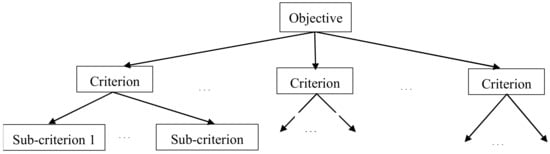 - The objective and the evaluation criteria were organized in a hierarchical structure. The first level (level 1) of hierarchy describes the objective, the second level (level 2) describes the main quality criteria, and the third level (level 3) gives the sub-criteria related to each main criterion. This is shown in Figure 2.