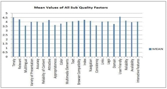 ‘Content’ is found as most significant quality factor, the basic objective of e-learning systems is to facilitate and help learners by imparting them with apposite learning content and services to meet their learning needs []. The content factor is related to the learning material and the features presented by e-learning websites to learners. Therefore, this factor plays an important role in the success of web based e-learning systems as an effective content is the main concern of learners when visiting an educational system. The related sub-factors are also important as all of them emphasize on the effectiveness of content so that quality learning experience could be delivered. Firstly, ‘Timely’ sub-factor has been noticed to be the most important factor among others, it indicates that the content of the website should be updated on regular basis to reflect the latest development and progress made in the field or area of study []. Secondly, the content should always be accurate and authentic so that e-learning system would be perceived as trustworthy learning source. Thirdly, the learning material should be presented using variety of resources including video, images, graphics, audio, animation and simulation to add value and to accommodate the learning needs of learners with diverse learning preferences []. Lastly, the variety of learning material should be relevant to the topic being discussed and to the level of students to whom the contents are being delivered. The finding of this research is similar to previous research in which emphasis is also given on ‘Content’ and declared it as one of the most important factors to evaluate the quality of web based e-learning systems [].