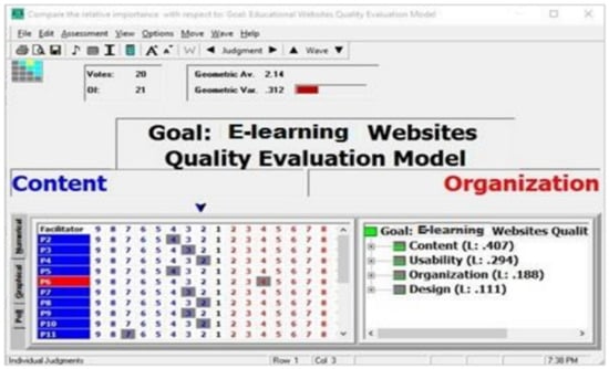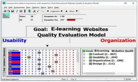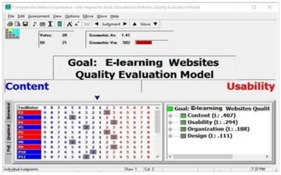 In order to complete all steps of the pairwise comparisons, the Expert Choice software was deployed to estimate the relative weights (priority) of the criteria and sub-criteria. These weights were the final relative importance value of each quality evaluation criteria and sub-criteria. The weights were categorized into “global weights”, which were the weights of the four main criteria, and “local weights”, which were the relative weights of sub-criteria. The global weights are shown on the right-hand side of the screenshot of Figure 5 and listed in Table 6. On the other hand, local weights are shown in Table 7, Table 8, Table 9 and Table 10. The local and global weights were computed in the Expert Choice software in accordance with Equations (3)–(5). The global weights included the weighted importance value for content, design, organization, and usability, and the local weights were relative importance values for the 15 sub-criteria.