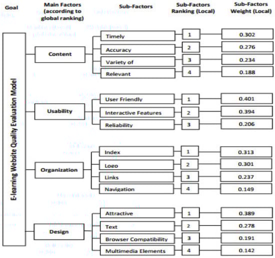 The quality of a product or a service directly affects the satisfaction of its user. E-learning websites are continually being designed even by developing countries to reinforce their education systems. The basic motive behind such rapid development of web-based e-learning resources is to achieve academic excellence. However, these websites suffer deficiency and ineffectiveness in their usage, owing to their poor quality. An evaluation of an e-learning website in terms of quality is a challenging task. Nevertheless, the quality level of e-learning websites can be investigated with the help of any suitable framework or model. This study has extensively reviewed the literature to identify the key quality factors that would be used to evaluate the quality of e-learning websites. The AHP technique has been used to prioritize the quality factors for the evaluation of e-learning websites. Finally, an effective evaluation model has been proposed. However, there are certain limitations of this research that should be addressed in the future. To achieve a quality evaluation model, this study only considers stakeholders from the urban areas of developing countries. The stakeholders belong to a mainstream community of students and teachers; however, there are many others with different incapacities and disabilities who are not included in this study. The students also differ from each other in terms of their learning abilities, capacities, orientation, and emotions, which are also not considered. The future research would be planned with two independent studies that consider a large sample from rural environments, as well as urban environments of developing countries to reveal if there are any divergent results. Additionally, the individual differences of learners and their special needs should be considered so that a universal quality evaluation model can be proposed. E-learning systems are mainly web-based systems that are open to computer threats, so security is an important concern in these systems and will help in leveraging overall cybersecurity []. The e-learning is penetrating into education at a very fast pace. Information should be actively secured to prevent the loss of privacy, availability, and integrity []. It is, therefore, vital to identify and understand the threats to the systems in order to develop secure e-learning systems. Web based e-learning systems should explore with respect to cloud computing technologies which have changed the way to develop and access applications. Moreover, instead of AHP, there are other multi-criteria decision analysis techniques that exist, such as Fuzzy AHP and TOPSIS, which should be explored in future research.