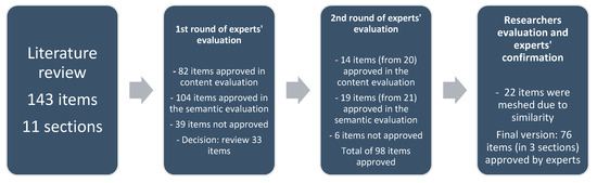In total, two evaluation steps were necessary until the agreement between experts for the content validation and two rounds for the semantic evaluation. Besides, assessment by researchers and endorsement by experts was carried out, to conclude all contributions and remove items with repeated content. Figure 1 presents the steps of the checklist validation process.