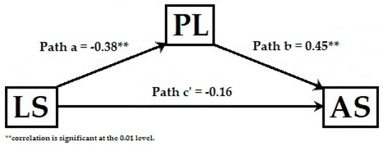 As Figure 2 depicts, the standardized regression values between the level of LS and the level of PL was statistically significant, as was the standardized regression value between PL and the level of AS. The standardized indirect effect was (−0.38) × (0.45) = −0.17. These results support the mediation hypothesis. After the inclusion of the mediator (full mediation), the level of LS was no longer a significant predictor of the level of AS. Approximately 28% of the variance in the AS variable was accounted for by the predictors, i.e., LS and PL (r2 = 0.28). Unstandardized indirect outcomes were calculated for every 5000 bootstrapped samples, and the 95% confidence interval (CI) was calculated by establishing the indirect outcomes. The bootstrapped unstandardized indirect outcome was B = −0.10, standard error (SE) = 0.04 and the 95% CI ranged from −0.21 and −0.04. The Sobel test score was −0.10, SE = 0.04, p < 0.01. These results show that the indirect effect was statistically significant.