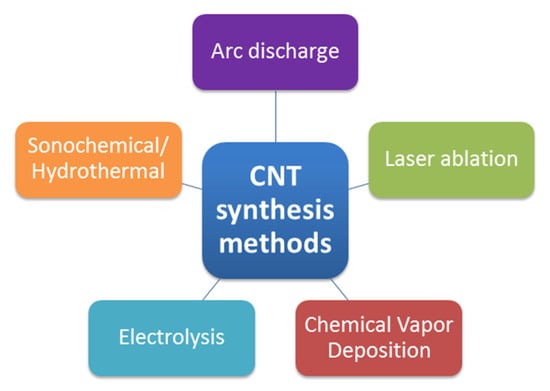 - Prasek, J.; Drbohlavova, J.; Chomoucka, J.; Hubalek, J.; Jasek, O.; Adam, V.; Kizek, R. Methods for carbon nanotubes synthesis—Review. J. Mater. Chem. 2011, 21, 15872–15884. [Google Scholar] [CrossRef]