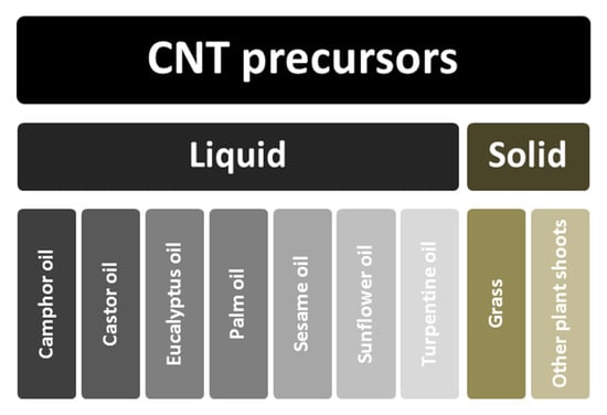Two classes of CNT precursors are discerned in this review: liquid and solid. Admittedly, the synthesis can also be accomplished from biogas by processing various feedstocks [103,104], but these cases are not considered herein since they are less established. The most popular routes described here involve essential oils harvested from a wide spectrum of sources or they engage certain plant shoots. They are listed in alphabetical order in Figure 2.
