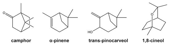 Y-zeolites as the catalyst substrate provided an excellent platform for CNT synthesis when eucalyptus oil was employed as the carbon source [120]. In this case, the material of predominantly single-walled CNT nature was obtained. The CNT had high purity and their diameter distribution spanned from 0.79 to 1.71 nm as probed by Raman spectroscopy. Since eucalyptus oil is comprised of many bicyclic chemical compounds (Figure 3, excluding camphor) [121], which resemble camphor, the product is characterized by a low degree of contamination due to the reasons already described above for camphor. Besides that, zeolites make suitable special constraint to the synthesis process, so that the process yields predominantly single-walled CNTs [122,123]. When the synthesis was conducted in the absence of these spatial limitations, multi-walled CNTs were obtained from eucalyptus oil [124]. A relatively high amount of defects and other carbonaceous species in that material can be justified by a surplus of catalyst used for the process (as compared with other works), which promotes side reactions giving other forms of carbon [113].