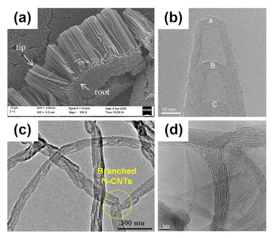 - Tang, C.; Bando, Y.; Golberg, D.; Xu, F. Structure and nitrogen incorporation of carbon nanotubes synthesized by catalytic pyrolysis of dimethylformamide. Carbon 2004, 42, 2625–2633. [Google Scholar] [CrossRef]