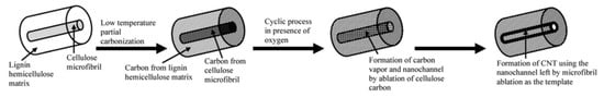 Alternatively, CNTs can be obtained directly by thermal pyrolysis of biomass such as grass or leaves. Perhaps the first to report the former opportunity was Kang et al., who showed that appropriate processing of grass in the presence of oxygen transforms it to multi-walled CNTs [140]. Grass has a large content of vascular bundles composed of cellulose, hemicellulose, and lignin, which, as other polymers, can be dehydrated to give elemental carbon [141]. In such an approach, initially, the grass is dried, crumbled, and heated at about 250 °C in the air to disintegrate unwanted proteins and greases. Then, after washing the substrate from these residues, the CNT precursor is transferred to a closed container filled with a suitable amount of oxygen, which is subjected to cyclic heating to 600 °C for short periods of time, between which the depleted oxygen is replenished. After ca. 50 cycles, multi-walled CNTs are produced. The authors justify the successful synthesis by the presence of tubular carbohydrate structures in the parent material, which structurally resemble CNTs. As the polymer dehydration proceeds, vascular bundles contract about three times in diameter to give multi-walled CNTs of 30 to 50 nm diameter distribution. An appropriate amount of oxygen is deemed necessary to hamper many possible side-reactions, which could predominantly lead to char and tars rather than the desired nanostructure. Subsequent research by Goodell and co-workers confirm that the precursor structure is a key factor for the synthesis of CNTs [142,143]. In their work, multi-walled CNTs of 10 to 20 nm diameter were obtained from dehydration of cellulose microfibrils present in wood fiber after similar cyclic oxidation. Subsequently, they also validated the importance of the aforementioned pretreatment step at low temperature [144]. The results of the experiments showed that exposure of the raw material first to 240 °C increases the yield of the transformation and the microstructure of the obtained product by initial dehydration of cellulose and stabilization of lignin. Then, the dehydration leading to CNTs proceeds in a templated way to a larger extent. The mechanism, which summarize the described findings is given in Figure 5.