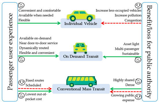These issues are summarized in Figure 1. From a service operator’s perspective, these conventional services, which operate on fixed routes and fixed schedules, can be cost-effective during peak periods where the fleet capacity is fully utilized. However, they are usually found to perform poorly outside peak hours, especially in low-density areas [8].