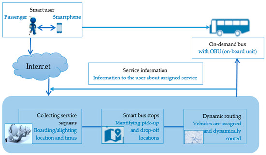 Taxi services are the most conventional DART option. These operate with the highest personalized public transport service. However, they have a high cost and they do not provide a solution to encourage high occupancy vehicles on roads. Shared services, on the other hand, have flexible schedules and routes, operate on-demand and focus on delivering door-to-door services. The pioneers of this business model (namely Uber and Lyft) recently introduced options where people can share their rides with other passengers travelling in the same direction (car-pooling) [15,19]. The key success factor for these shared services is the proliferation of mobile-phone-based digital platforms where users can simply choose the best mode to travel to their desired destination and book their trips over a mobile application. The basic architecture of the on-demand bus system is illustrated in Figure 2.