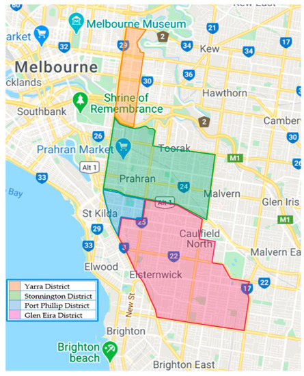 The selected study area covers parts of four local government areas (LGAs) of Melbourne namely, Yarra, Stonnington, Port Phillip and Glen Eira districts as shown in Figure 3. The study area is around 28.9 km2 consisting of 134 signalized intersections. The main reasons for selecting this study area for the case study are outlined below: