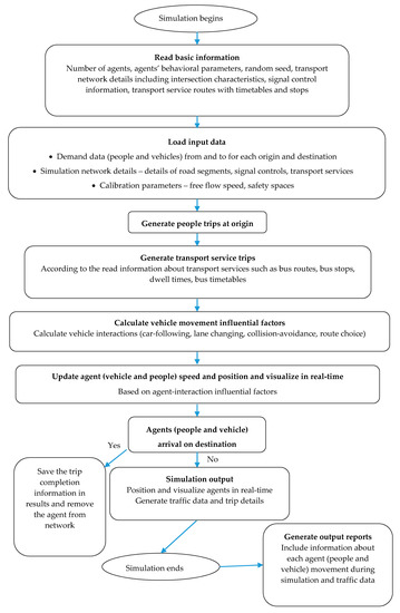 Traffic simulation is characterized by a high level of modeling detail. The accuracy of the model depends on the availability and quality of the input data. After the road network is coded and the traffic demand, traffic control and public transport data are entered, the traffic conditions defined by the trip matrices are simulated. This task includes the proper selection of global modeling parameters and parameters governing car following and lane changing behavior. The modeling also includes traffic control and public transport. Traffic simulations generally take into account different types of traffic control including traffic signals and give-way signs [53]. Public transport modeling includes the definition of a public transport lines (routes, reserved lanes and bus stops), the timetables for each line (departures schedules and stop times) and the type of public transport vehicle (bus, mini-bus or tram.). This task also includes selecting the parameters of the simulation experiment. The set of parameters that characterize a simulation experiment include simulation timing, modeling, reporting and route choice. The simulation run time parameters include the specification of start and end times for the simulation in addition to the specification of the warm-up and cool-down periods. Finally, the model is run using these parameters and the simulation results are verified to determine that the model is performing as intended.