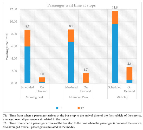 Waiting times at stops include two components. The first component, T1, is the waiting time for the arrival of first bus service, which is the time from when a passenger arrives at the bus stop to the arrival time of the first vehicle of the service, averaged over all passengers simulated in the model. The second component, T2, is the time from when a passenger arrives at the bus stop to the time when the passenger is on-board the service, also averaged over all passengers simulated in the model. This differentiation is important because sometimes (especially with the scheduled bus services) the first bus that arrives is either late or full, or there are a large number of passengers waiting at the bus stop resulting in some passengers not finding room to board the bus.