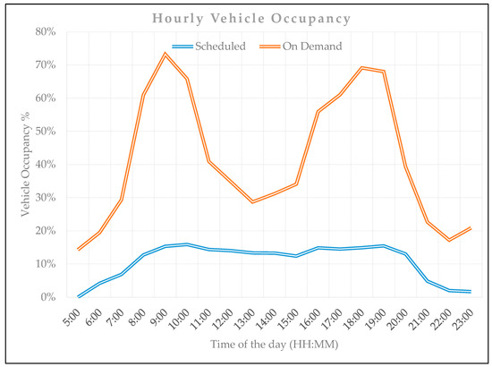 The hourly vehicle utilization rates for the scheduled and on-demand bus services are presented in Figure 6. These are calculated by dividing the number of passengers on-board (occupancy) by the total vehicle capacity, averaged every hour. For the scheduled bus services, the vehicle occupancy during peak ranged between 10% and 16%. This is significantly lower than vehicle occupancies for on-demand mini-bus services that were found to achieve around 70% occupancy during peak hours. Even during off-peak periods, the occupancies for on-demand services were almost twice the vehicle occupancies for scheduled bus services