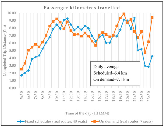 Passenger kilometers travelled (PKT) is the sum of the total distance travelled by all passengers who completed their trips within the simulation period. This includes passengers’ walking distance from the origin centroid to the nearest bus stop; distance travelled in the bus; and walking distance from the bus stop to destination centroid. The PKT results are presented in Figure 7 and show no significant difference between scheduled and on-demand bus scenarios because both services followed common bus routes. The slight differences in Figure 7 are attributed to different walking distances to the nearest bus stops. For example, fixed schedule buses do not run after certain times resulting in fewer travelers walking to the bus stops to use the service. For the on-demand services, however, they are available at all times meaning there would be more travelers walking to pick-up locations resulting in more walking distances. As shown in Figure 7, passengers (on average) travelled about 9 km during peak hours and 7 km during off-peak hours. The daily averages were 6.4 km for the scheduled services, compared to 7.1 km for the on-demand services.